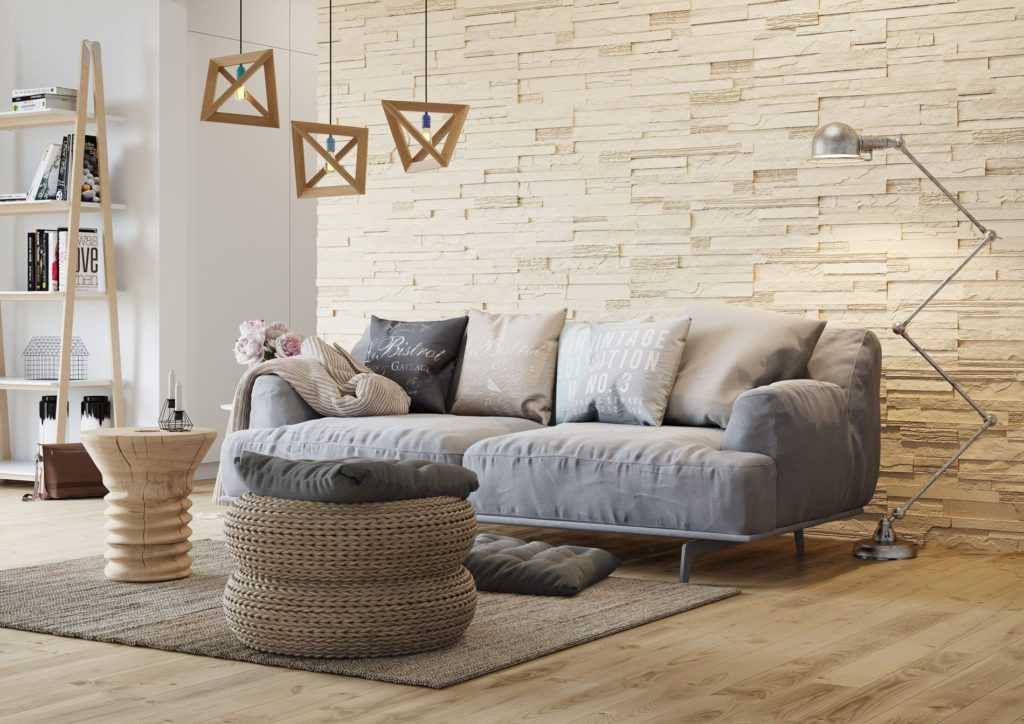 Стену за диваном можно акцентировать ламинатом. Он идеально подходит для акцентирования внимания в помещении и превращения его в главную точку интереса.