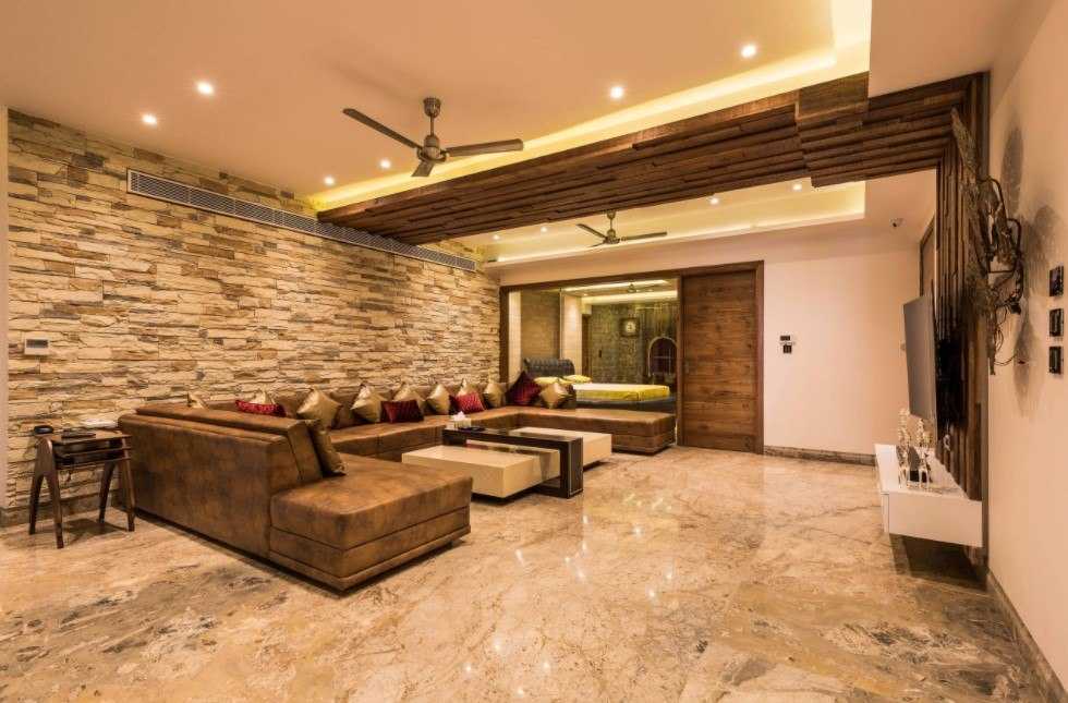 С помощью плитки «под камень» можно декорировать стены гостиной (как полностью, так и частично), окаймить окна, колонны и дверные проемы. Мозаика подходит для облицовки каминов, а также украшения стен: ее рекомендуется располагать вставками, чтобы не перегружать пространство.