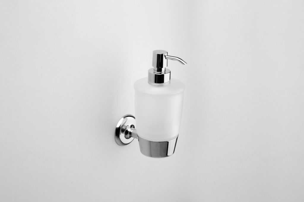 Отличием этого дозатора есть то, что он имеет хромовое покрытие. Этот настенный мыльный диспенсер может быть составлен из двух резервуаров. Объем каждого из них составляет 380 мм. Их общие габаритные размеры следующие: 15,5х8х22,5 см. Вес прибора составляет всего 560 г.