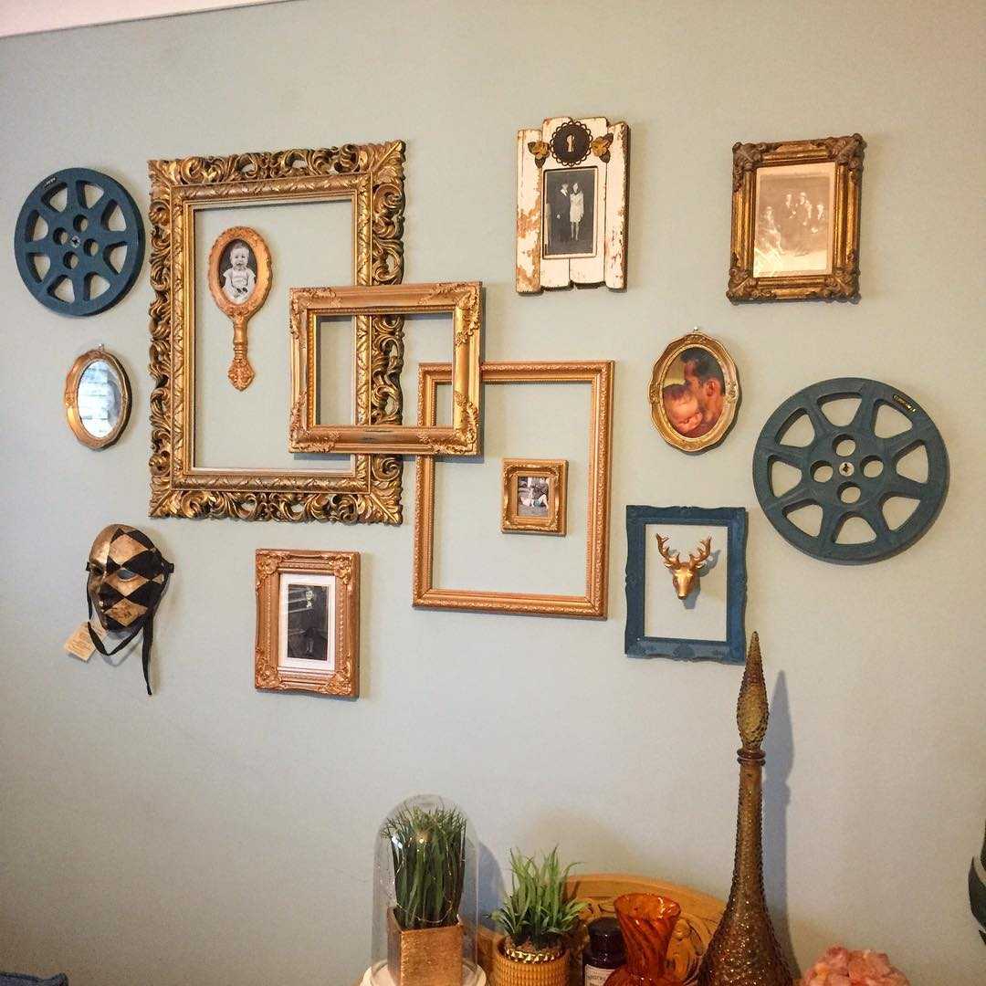 Фото в рамках можно чередовать с необычными элементами декора и картинками.