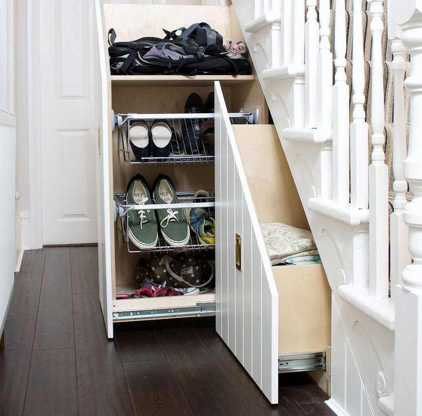 обладатели двухэтажных домов могут задействовать для полноценной объемной обувницы место под лестницей;