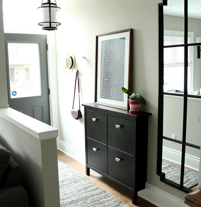В небольшой прихожей надо учитывать все нюансы, на разных фото обувницы в прихожие представлены в разных вариантах. Большой ассортимент предлагают магазины Икеа, обувниц в прихожую здесь огромный выбор – на разный вкус, метраж и дизайн. Как вариант – вешалка с обувницей в виде цельного модуля.