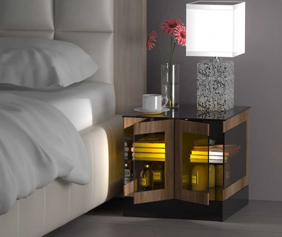 При оформлении спальни чаще используются напольные или стандартные прикроватные тумбочки. В них несколько полочек и дверок. Их изготавливают для множества стилей.