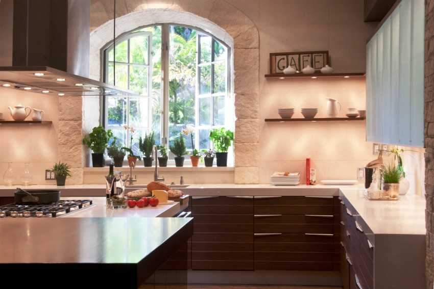 Например, если кухня расположена в узкой вытянутой нише, примените линейную или П-образную меблировку без верхних шкафов. Заменить шкафы можно открытыми полками.