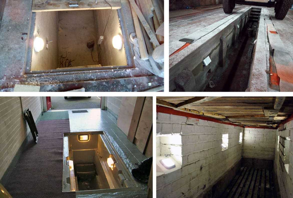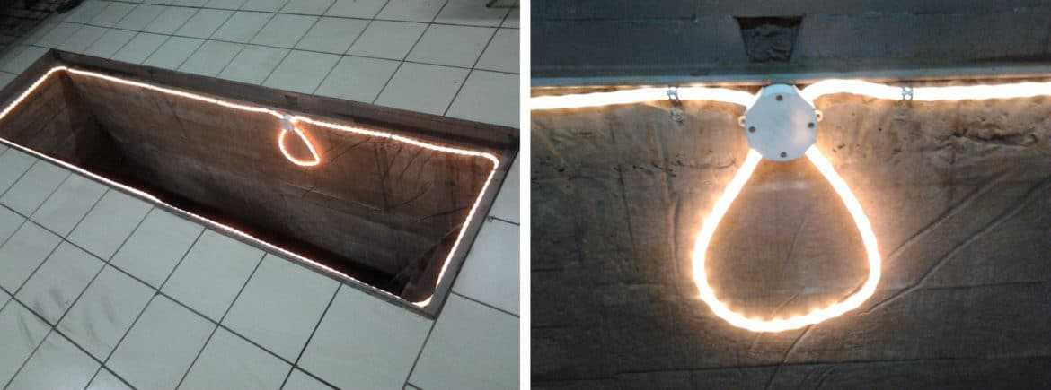 Для смотровой ямы необходима низковольтная схема, так как высокая влажность создает соответствующие требования безопасности. Допустимый максимум постоянного тока – 24 В, переменного – 36. Питание подается системой из трансформатора, стабилизатора и выпрямителя. Поток света должен направляться на днище транспортного средства. Использовать автомобильные трансформаторы нельзя.