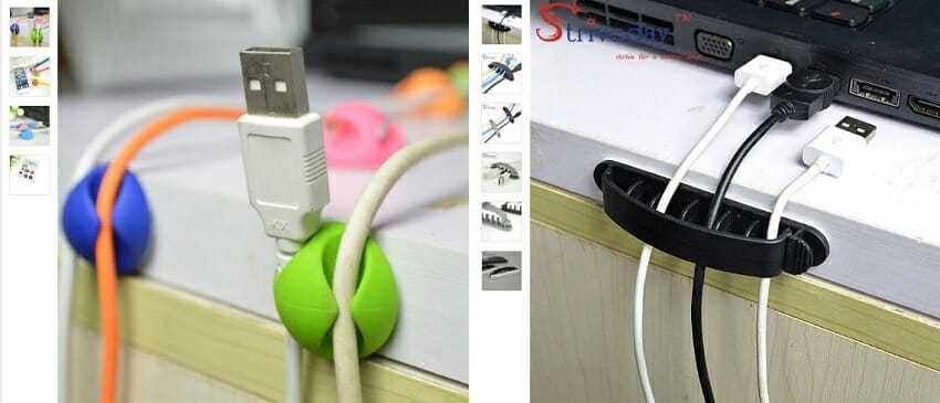 Закрепить и спрятать провода от компьютера под столом и в районе рабочей поверхности можно и с помощью обычных кабель-каналов и пластиковых жгутиков, которые используют электромонтажники. Также что-то практичное можно присмотреть на алиэкспрессе. Кодовое название – «кабельный зажим». Ну и много других китайских вариаций.