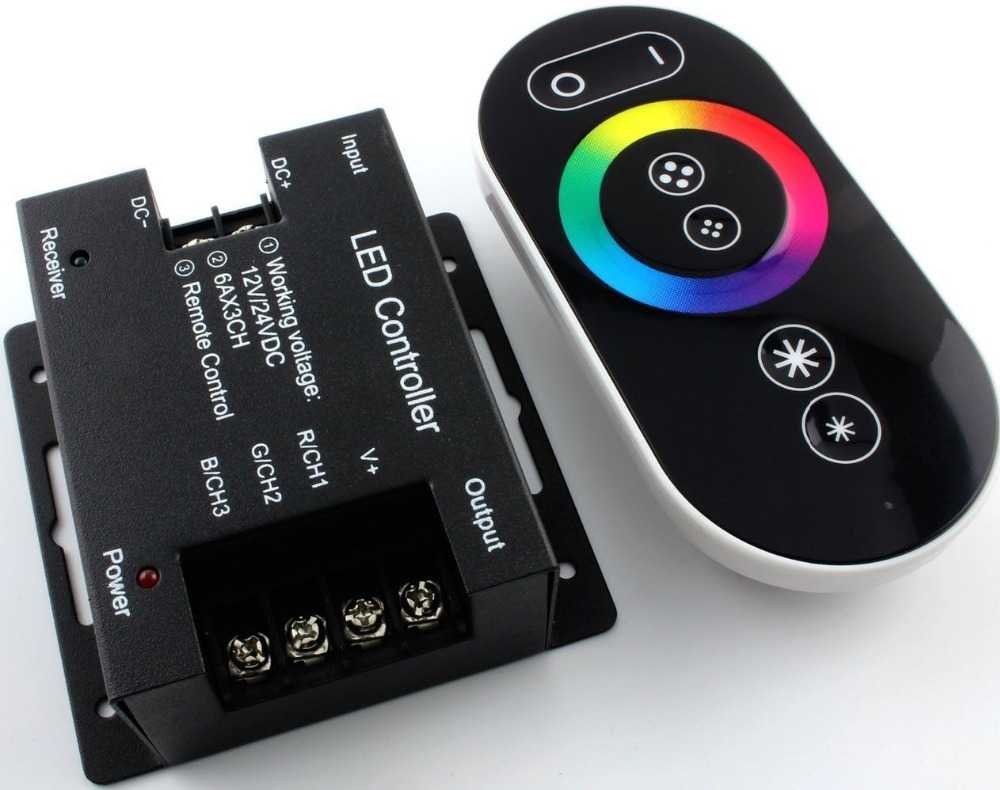 Регулирование и управление при подключении такого типа прибора осуществляется при помощи специального дистанционного пульта, который входит в комплект с самим переключателем. Контроль над лентой осуществляется при помощи радиосигнала или инфракрасного излучения. Но те модели, которые поддерживают управление радиосигналом стоят намного дороже, пульт позволяет регулировать освещение даже тогда, когда пользователь находится за пределами помещения.