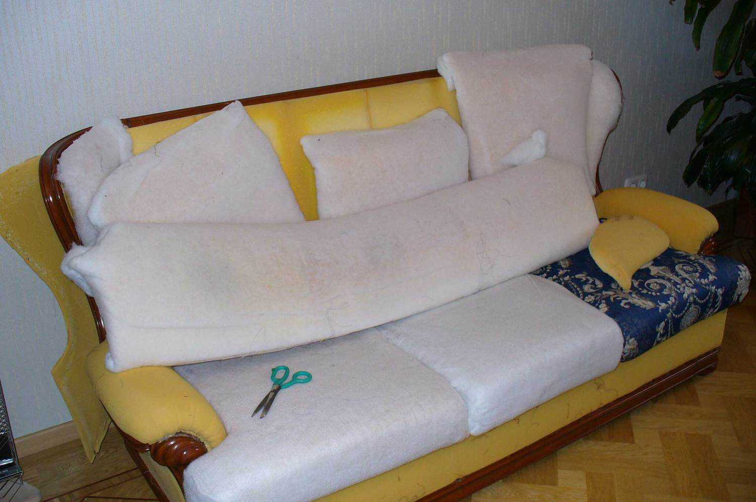 После того как ткань снята, как раз самое время оценить, какие именно части придется вам менять. С обивкой и подкладкой под нее все понятно. Пирог желательно сохранить в том же составе. Если использованы были старые материалы, которых нет сейчас в продаже или они слишком дороги, заменить современными аналогами. Главное для раскладных диванов — выйти на ту же высоту сиденья и спинки, которые были раньше, так как раскладные механизмы рассчитаны на определенные параметры «подушек». Чтобы не ошибиться с толщиной материалов, находите неизношенные (или наименее изношенные) участки и замеряете толщину.