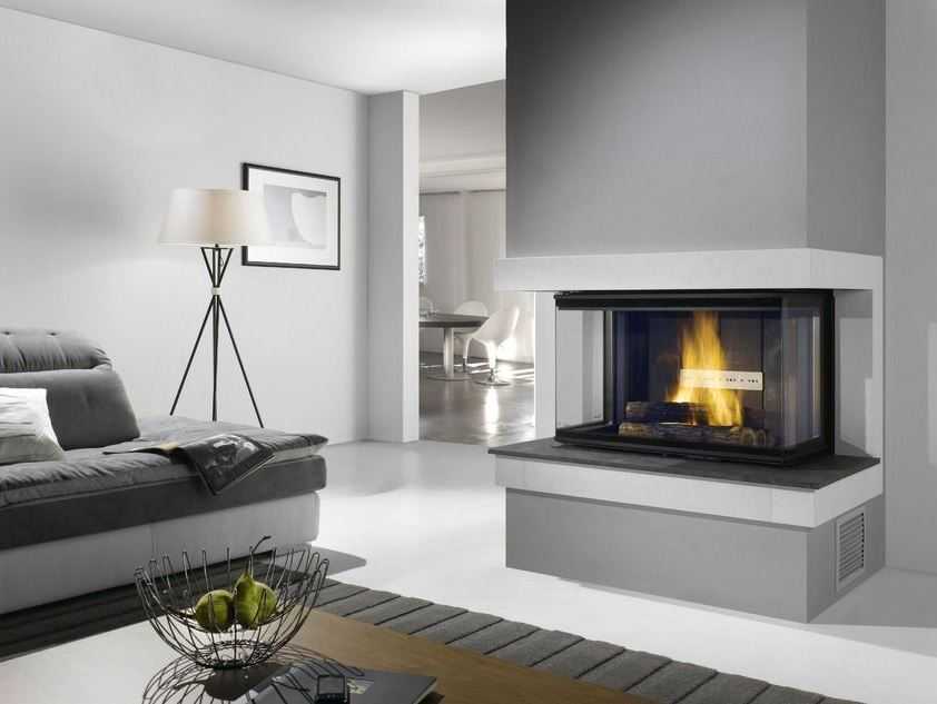 Такие камины чаще всего изготавливаются из стали, камня и стекла. Очень гармонично вписываются в стиль комнаты Хай-Тек трехсторонние панорамные модели с прозрачными стеклянными стенками. Они занимают центральное место в интерьере.