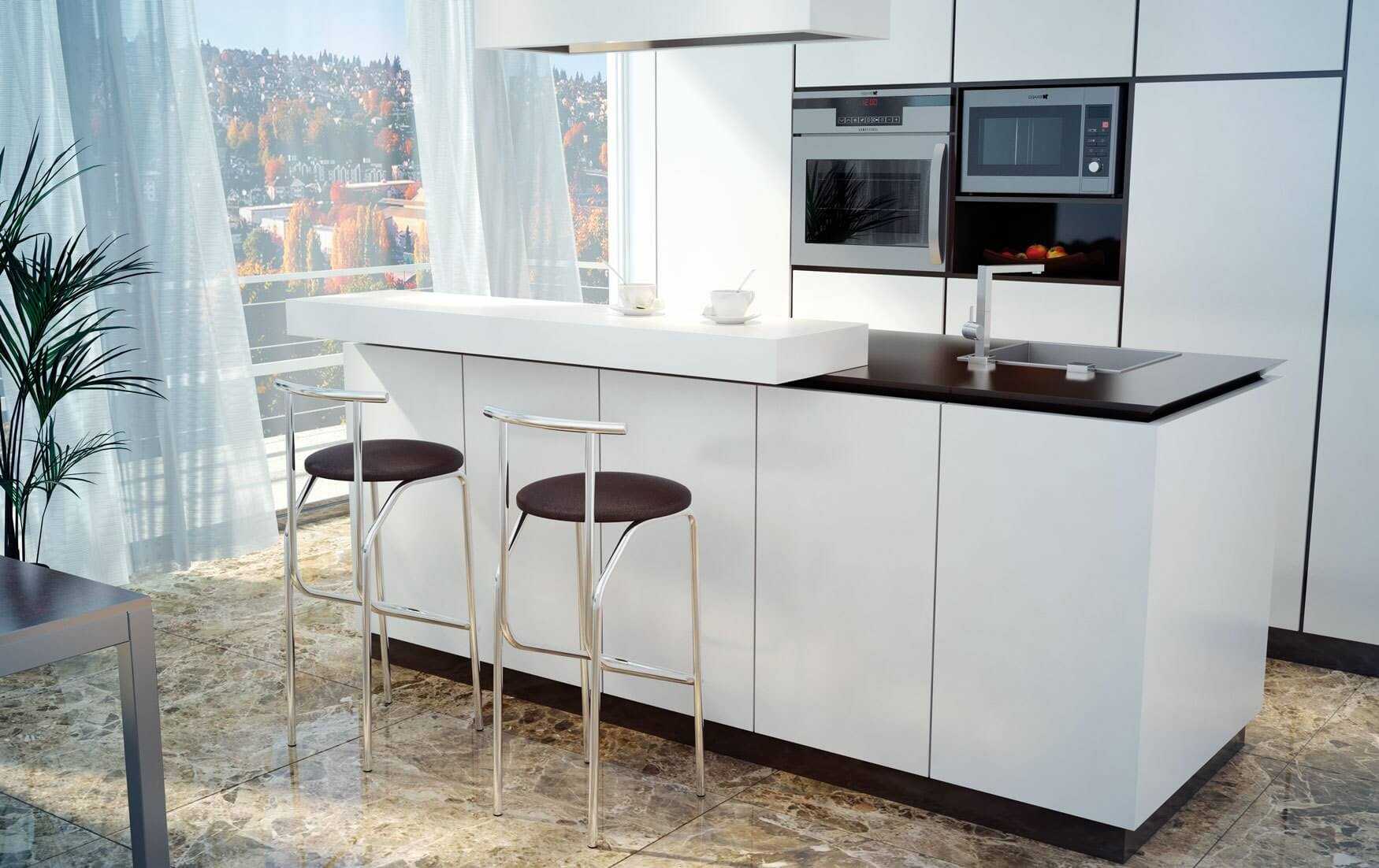 Практически так же популярны барные стулья на кухнях, оформленных в минималистическом стиле. Выбирайте простые традиционные формы и лаконичные материалы сдержанных цветов. Эксперименты тут скорее навредят.