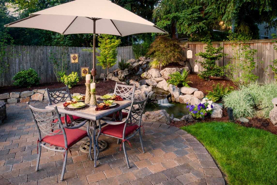 Некоторые ландшафтные дизайнеры советуют делать небольшое патио тем, кто планирует отдыхать на нем скромной компанией. С ними можно поспорить. Если у вас в запасе территория 15-20 м2, то на ней можно разместить не только садовую мебель, но и небольшой водоем. Уют никуда не денется, а комфорта станет больше.