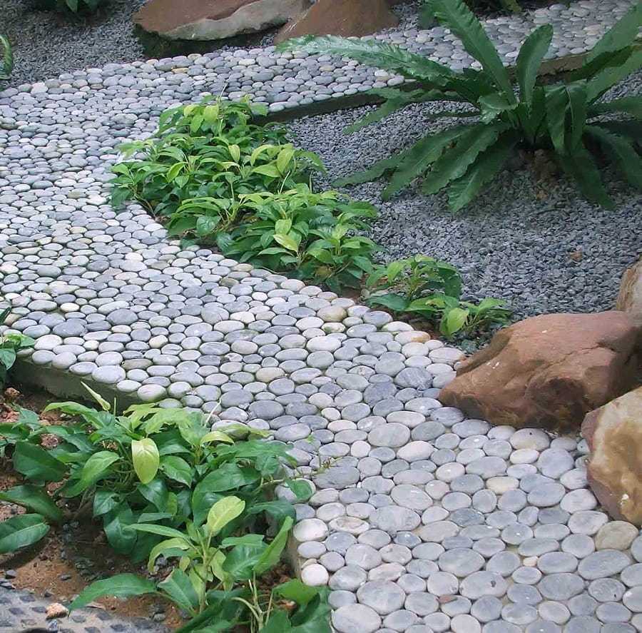 Уложив на свежезалитый бетонный раствор речную гальку вы получите удивительную по красоте дачную тропинку