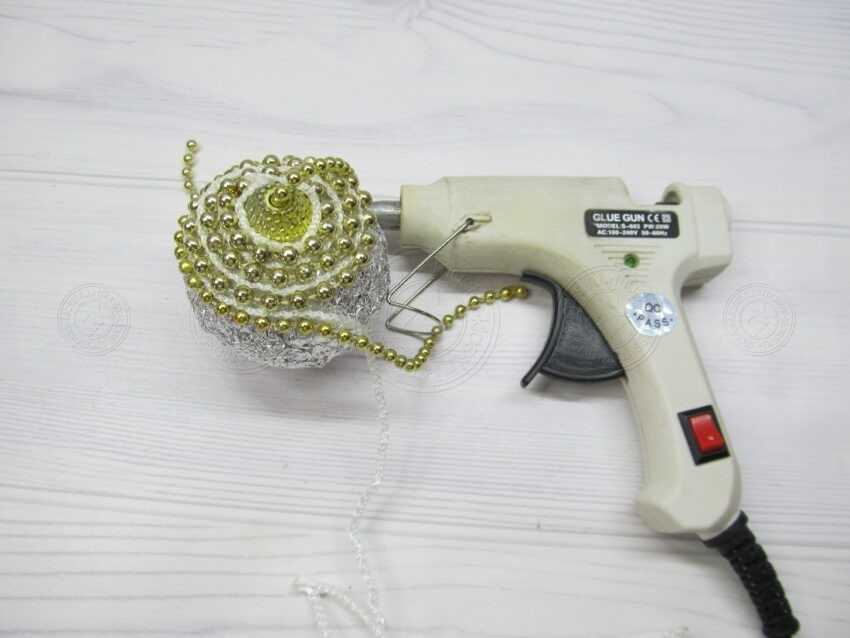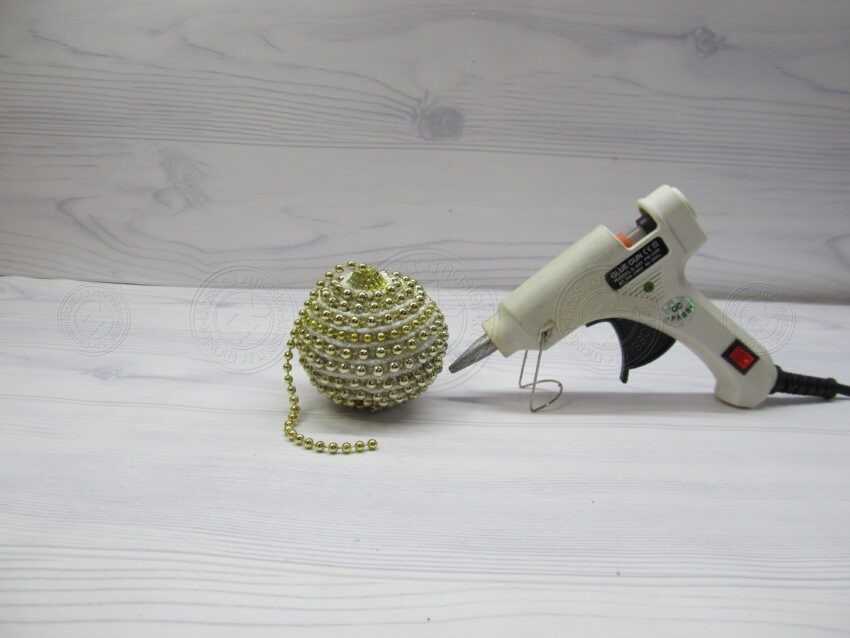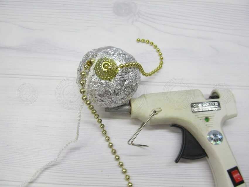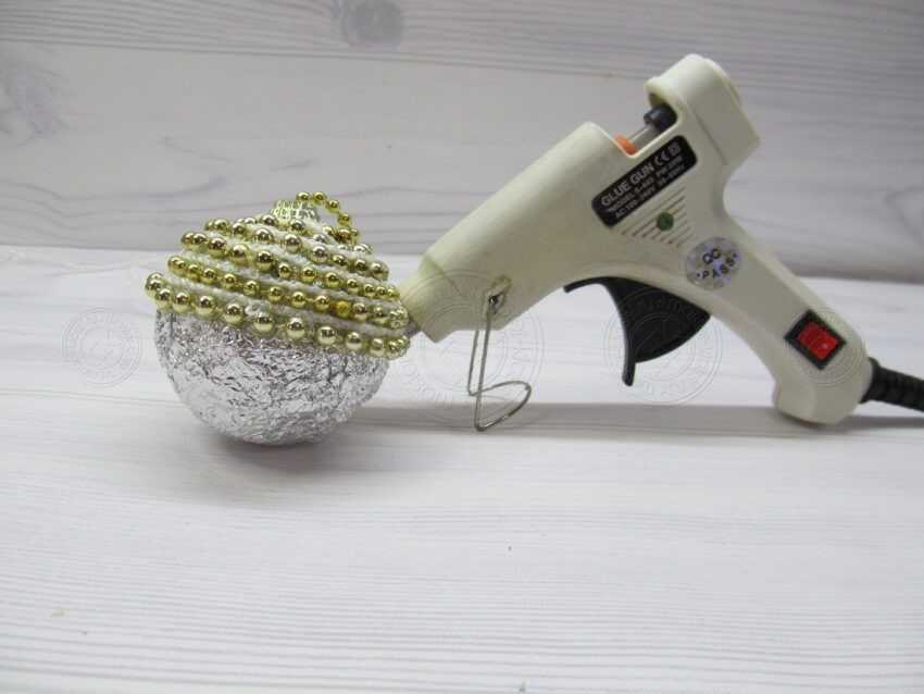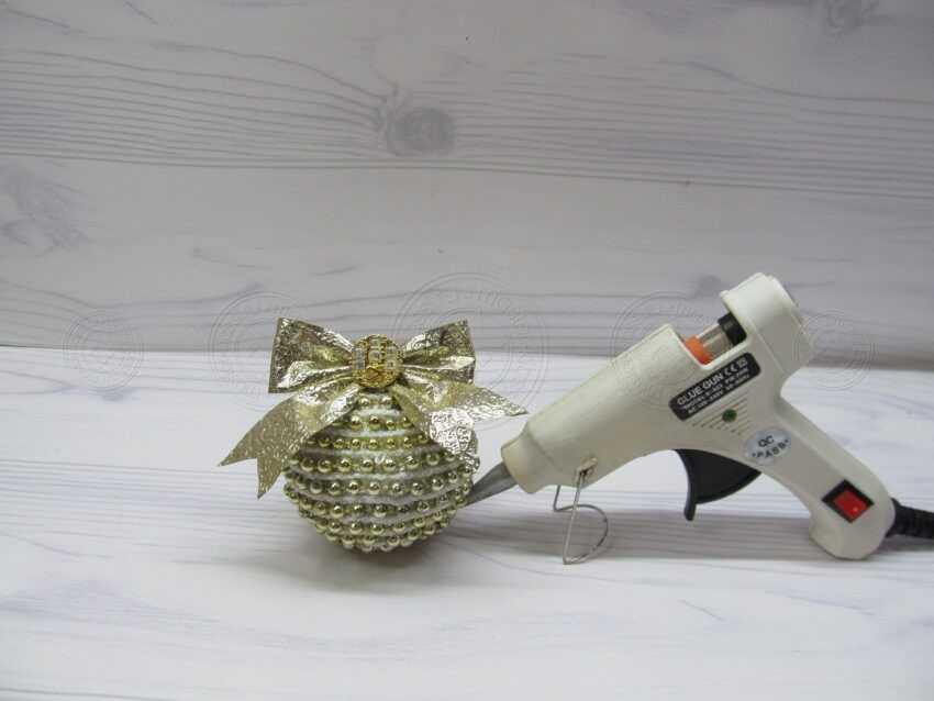 - Золотой атласной лентой обматывают весь шарик и закрепляют горячим клеем.