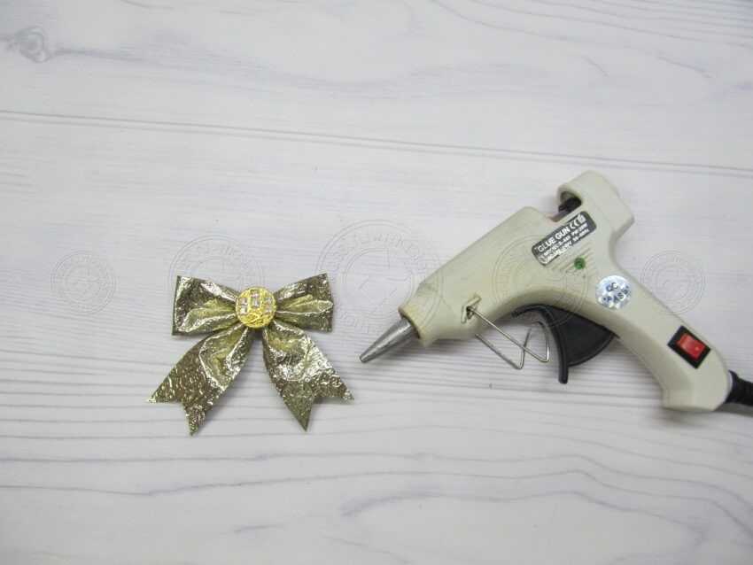 15. Используем пистолет, чтобы приклеить кабошон в центр банта. Подождите какое-то время, пока две детали не схватятся.