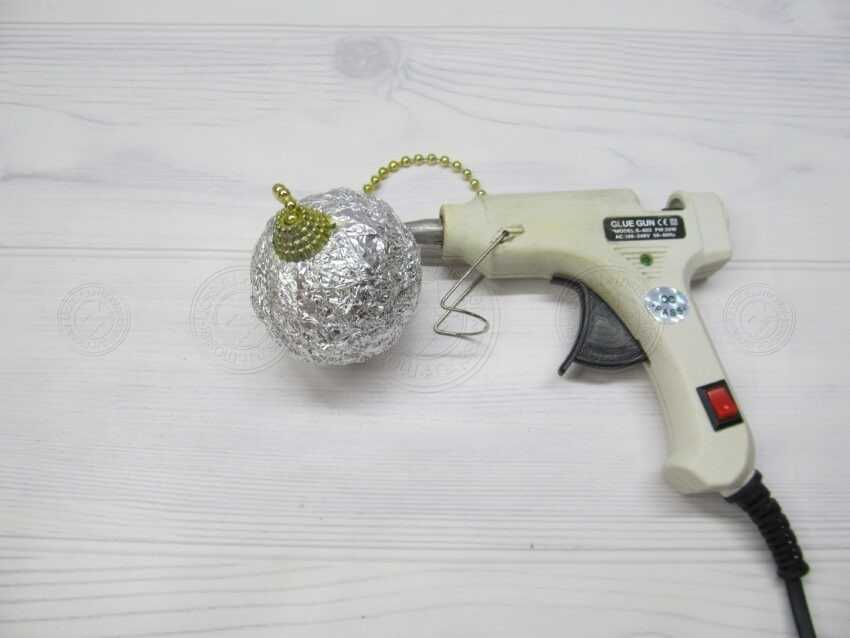 - Приклеить серебристой стороной наружу к шару с помощью пистолета. Выдерживать расстояние между кусочками 34 мм. Обязательно убрать излишки клея сразу, пока он прочно не прилип к шару. Таким образом оклеить всю поверхность. Для удобства шар можно положить в чашку с небольшим диаметром горлышка