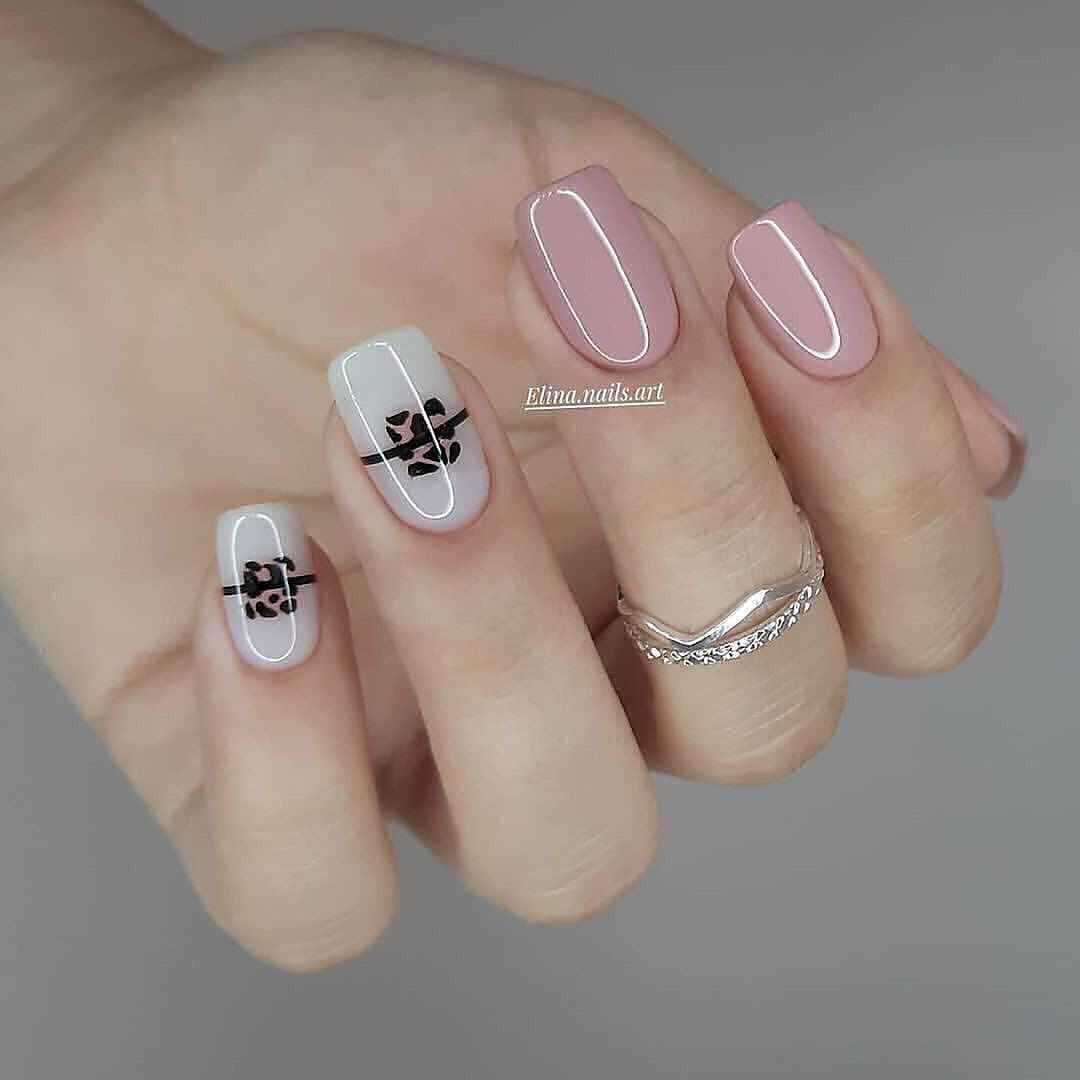 Например, можно покрыть бежевым цветом несколько ноготков, несколько молочных и на одном разместить небольшой прямоугольник с леопардовым принтом.