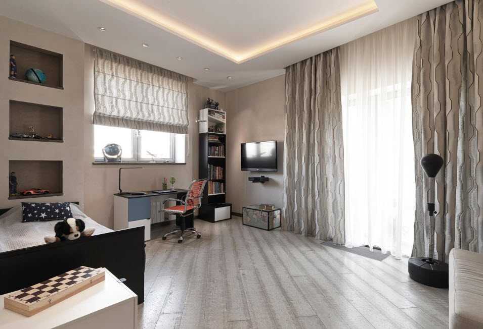 Если хочется чего-то необычного, то в качестве гардин стоит использовать римские занавеси из легкой ткани, а сверху разместить плотные шторы насыщенного оттенка.