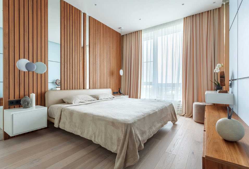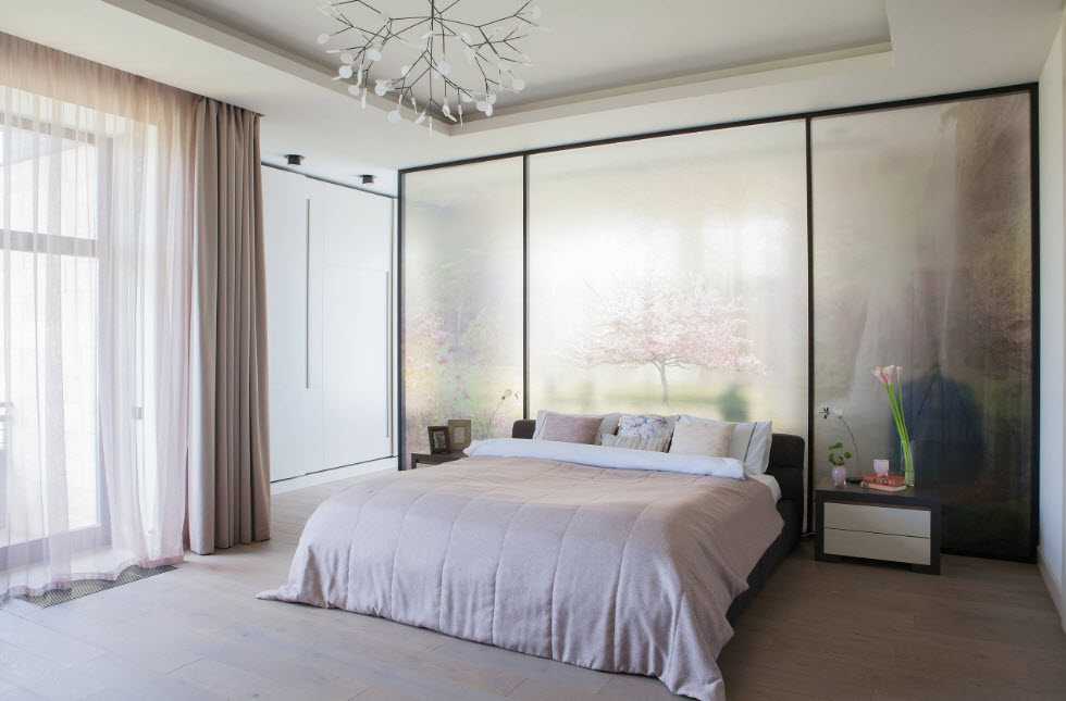 Популярное дизайнерское решение – панорамное остекление в спальне. Лучше всего кровать поставить напротив окна, которое обязательно оформить плотными шторами. Для этого подойдут и портьеры, и римские рулонные занавески.