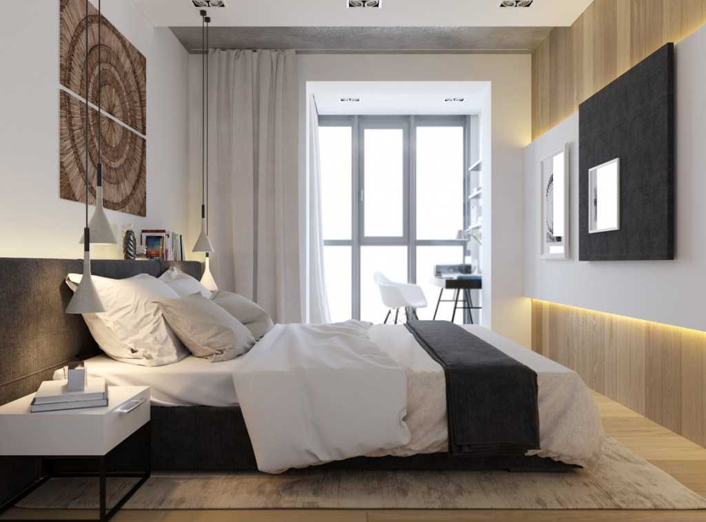 - наличие окна и балконного блока на смежных стенах – такой вариант очень интересен тем, что на балконе можно создать выделенную гостиную зону, затенив окна шторами и расположив рядом кровать;