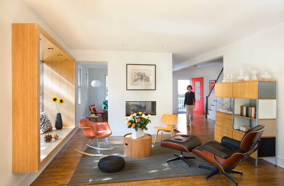 Если достаточно места можно выделить участок с камином или пространство для игры на музыкальных инструментах. Уже отмечалось, что зонирование можно проводить при помощи перегородок, ширм, освещения, отделочных материалов.