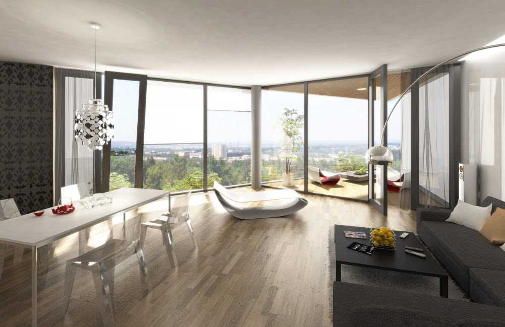 Интерьер с панорамными окнами подойдет практически для любой квартиры. Такой вариант застекления часто используют жители северных широт