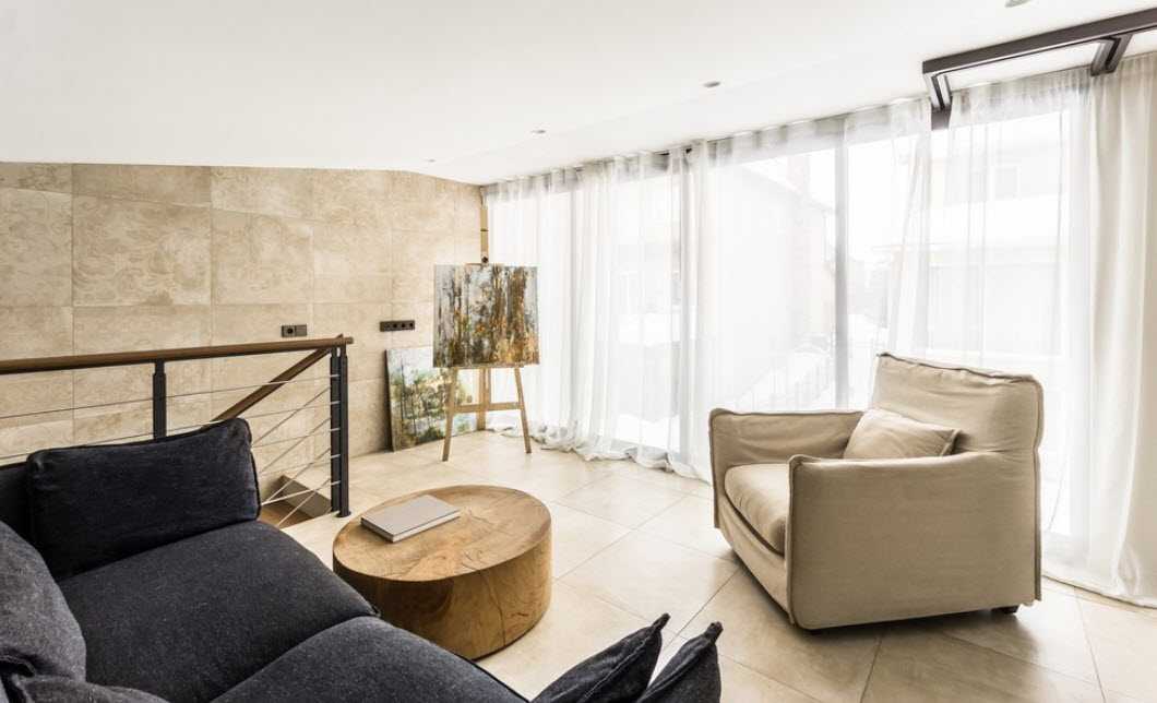 Один из них – вешать шторы под самый потолок, даже выше самих окон. Так вы еще больше визуально поднимите пространство. Этот прием смотрится особенно элегантно, если у вас не одно панорамное окно, а несколько.
