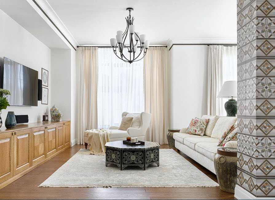 В гостиной на стекла лучше наклеить пленку, которая будет пропускать только часть яркого света. Для зала в классическом, английском или итальянском стиле подойдут витражи.