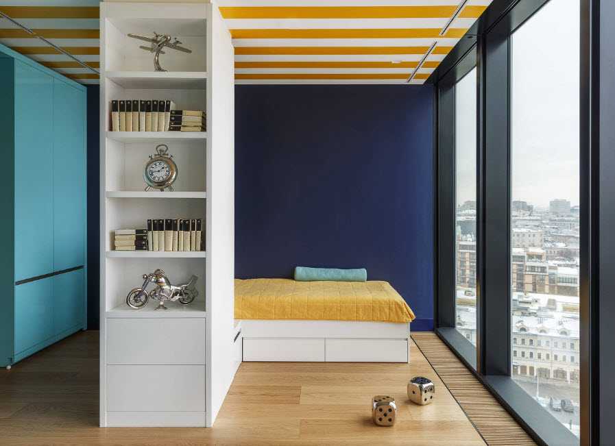 - окна находятся на двух смежных стенах – в этом случае гостиная зона будет угловой, кровать лучше располагать по диагонали или вдоль дальней стены, четко разграничивая пространство, выделяя место для сна и для общения с друзьями;