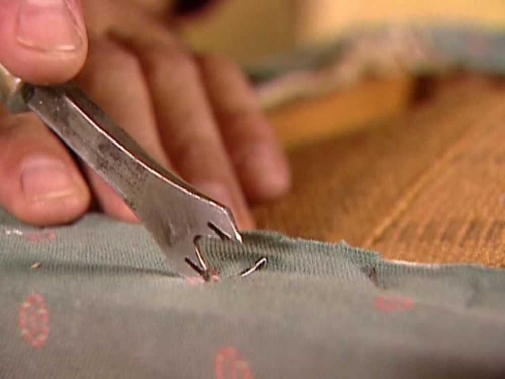 Растянув ткань на детали, ее нужно прибить скобами спереди и сзади. Затем свисающий угол в передней части натягивается, и закрепляется снизу. Ткань выкладывается складками так, чтобы они сходились в одной точке, и прибивается скобами.