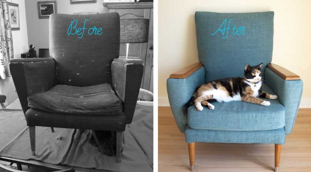 Пришла в негодность только ткань (порвали коты на подлокотниках, например), т.е. провалов в мягкой части и торчащих частей нет. Тогда все более-менее просто и можно обойтись заменой обивочной ткани.