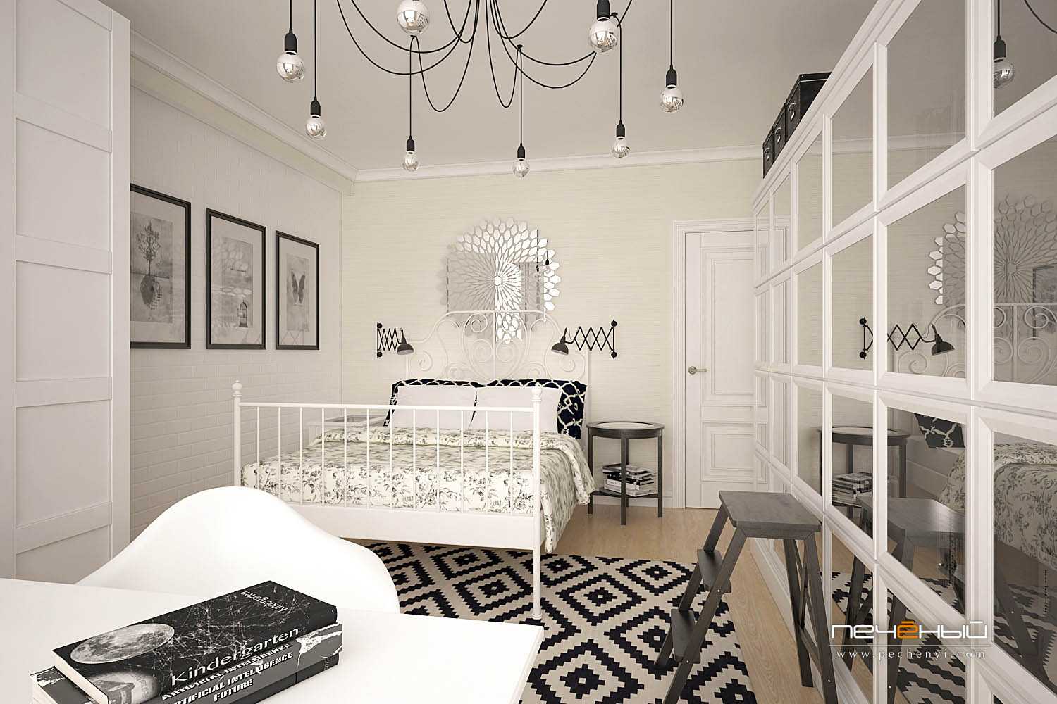 Спальня может ограничиться кроватью, стулом и тумбочкой, служащей как туалетным столиком, так и комодом.