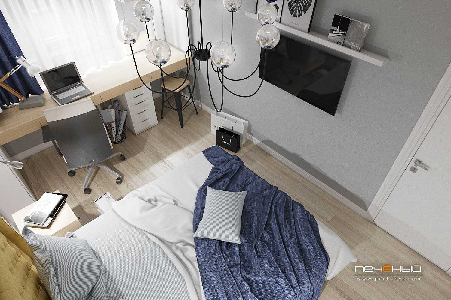Визуальное восприятие кухни было увеличено за счёт поднятия уровня кухонных шкафчиков, а гостиная совмещена со спальней и столовой, где соответствующую зону обозначил дизайнерский обеденный стол. Благодаря данным действиям стало возможным освободить одну из комнат под рабочий кабинет, а другую и вовсе оставить пустой для переоформления, в случае необходимости, под детскую. Смещение одних из дверей позволило установить диван, который, несмотря на скромные размеры, является отличным спальным местом для двоих гостей.