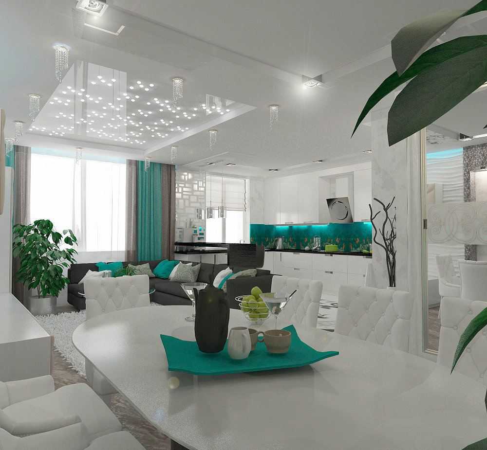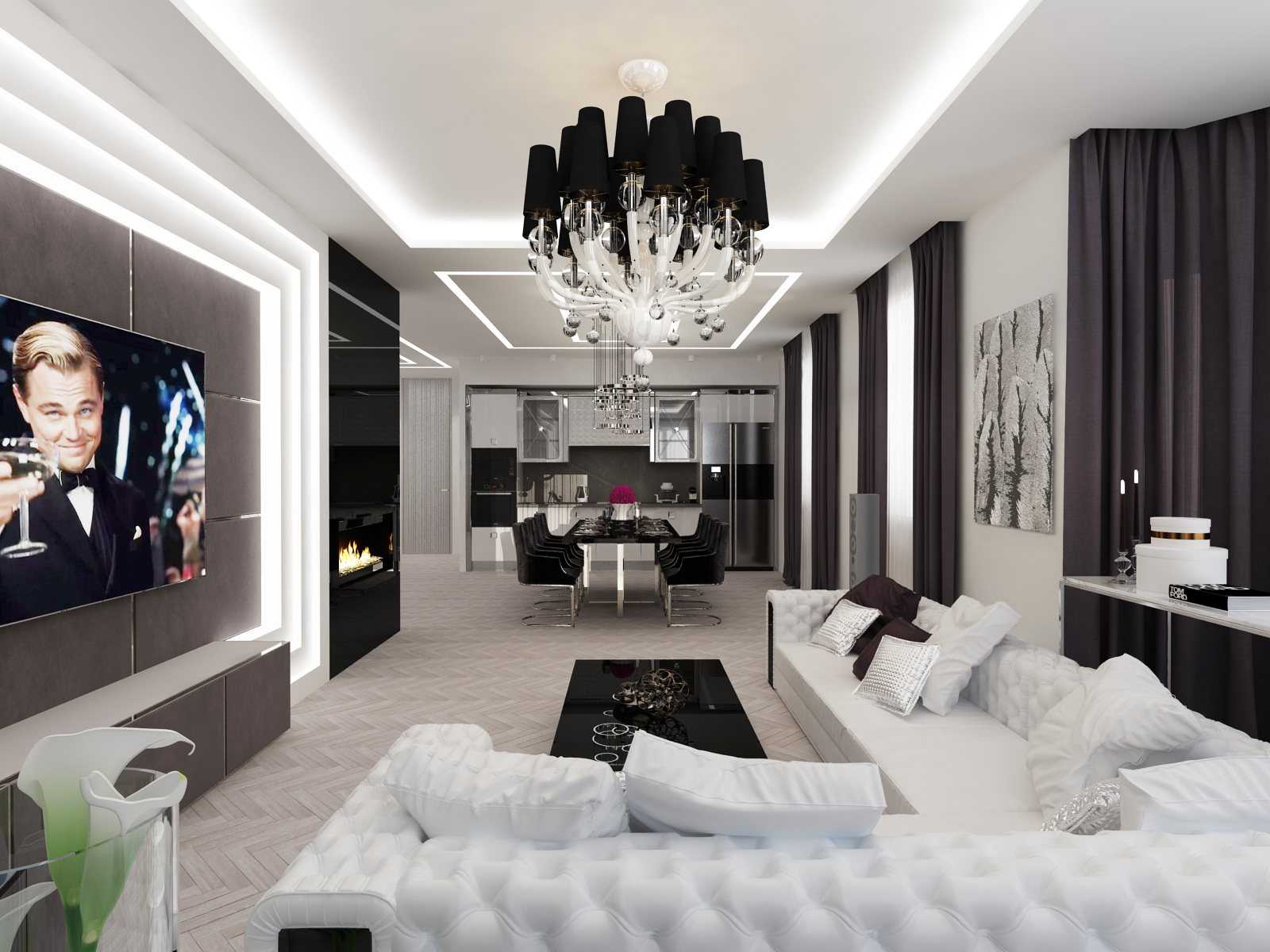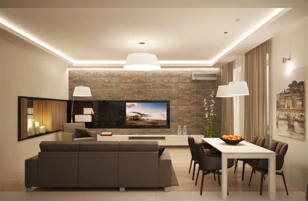 Оригинально смотрится гостиная, совмещенная с кухонной и обеденной зонами, выполненная в бежево-кремовых тонах: используя разную подсветку каждого функционального пространства, можно добиться ненавязчивой организации, при этом используя разные материалы для каждого участка зала.