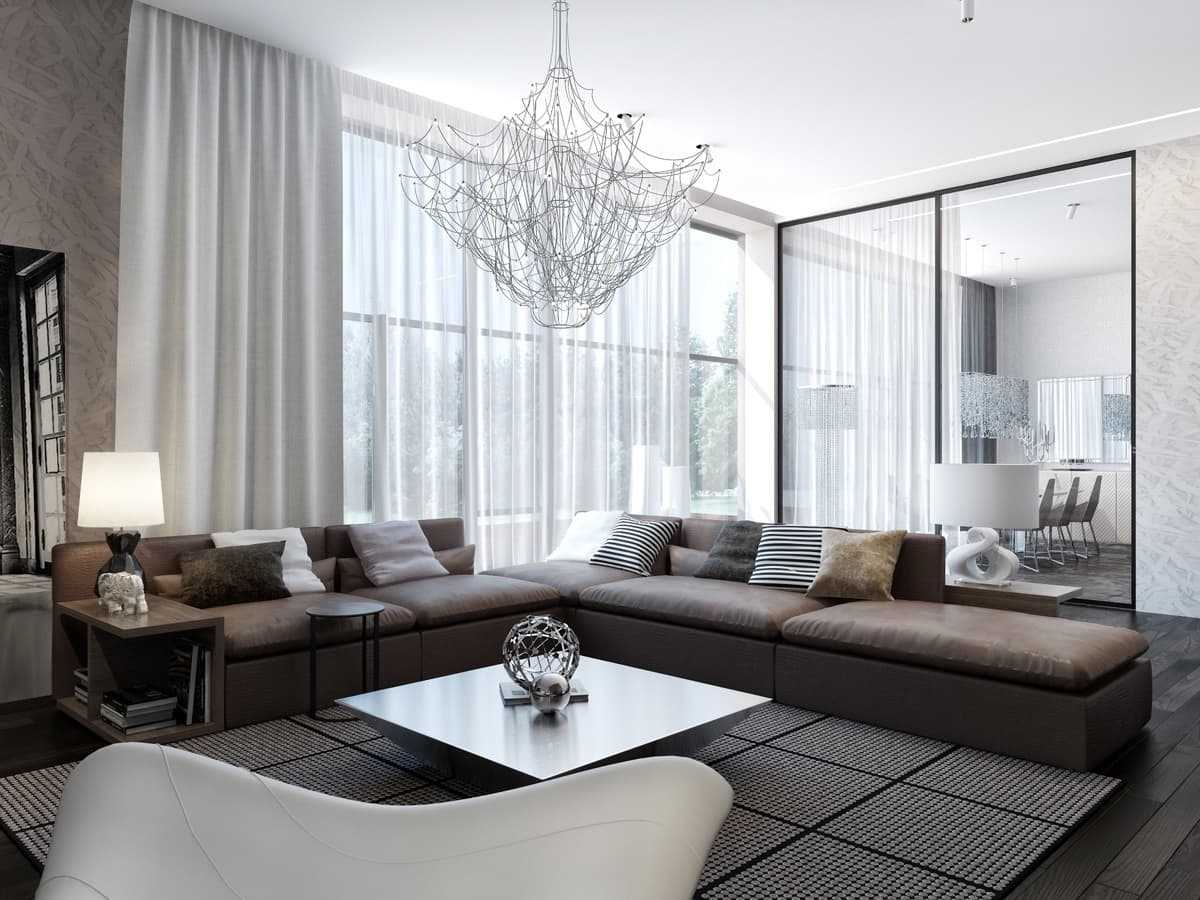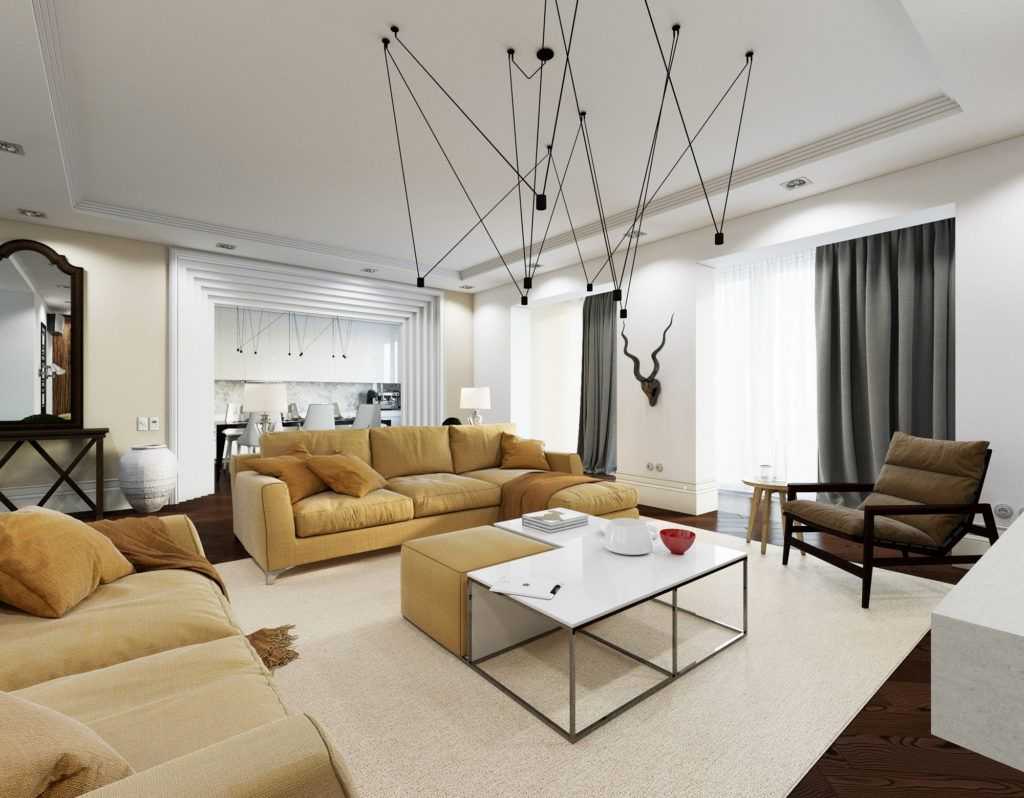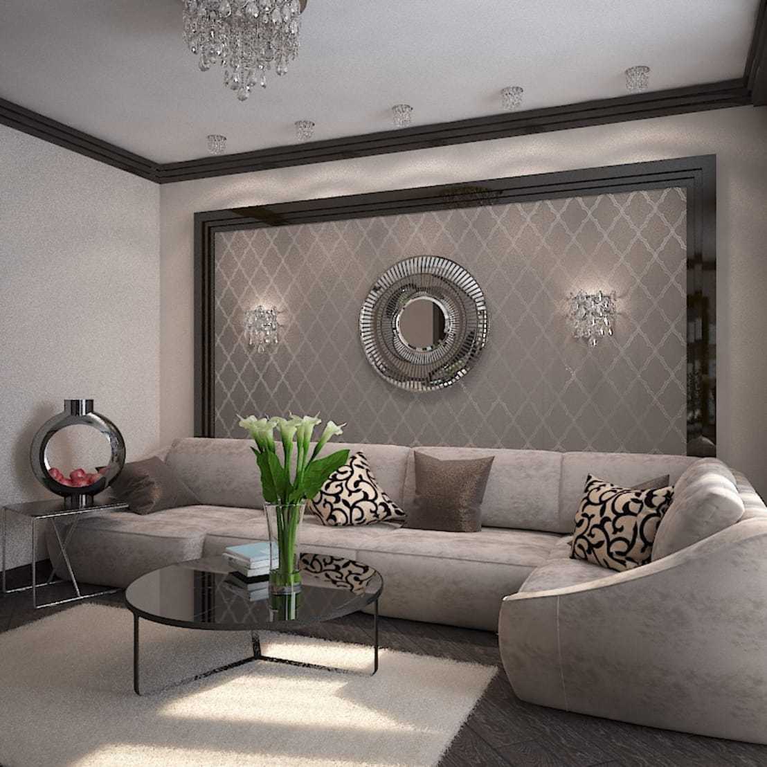 Можно поставить вдоль одной из стен серый угловой диван модульного типа с контрастными декоративными подушками, стены украсить бежевыми обоями с кружевным рисунком, подчеркнуть гостевую зону стеклянным столиком и светлым ковром, потолок и стены нарядить массивными светильниками со стеклом или хрусталем.
