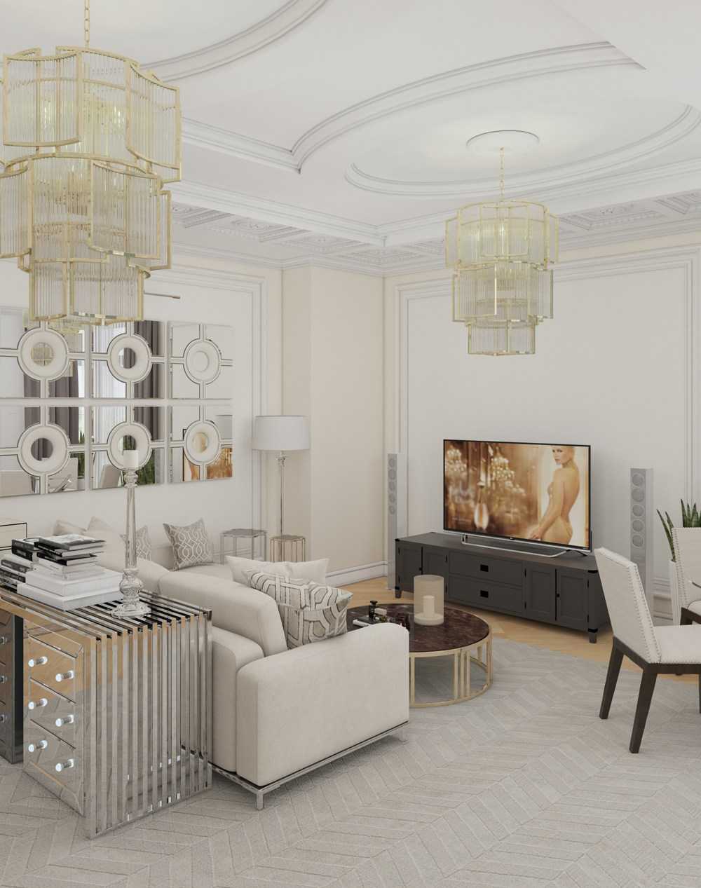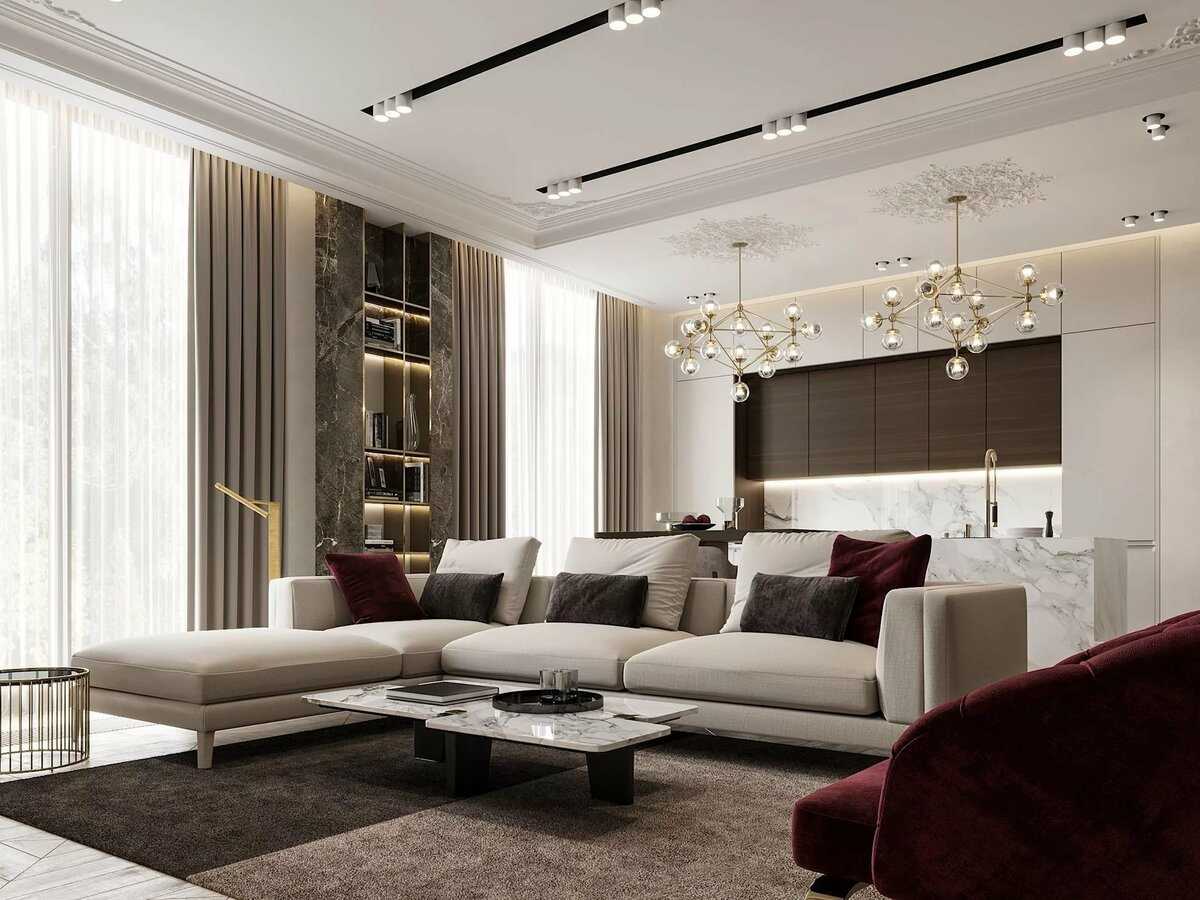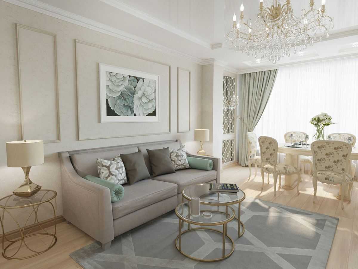 Можно поставить вдоль одной из стен серый угловой диван модульного типа с контрастными декоративными подушками, стены украсить бежевыми обоями с кружевным рисунком, подчеркнуть гостевую зону стеклянным столиком и светлым ковром, потолок и стены нарядить массивными светильниками со стеклом или хрусталем.