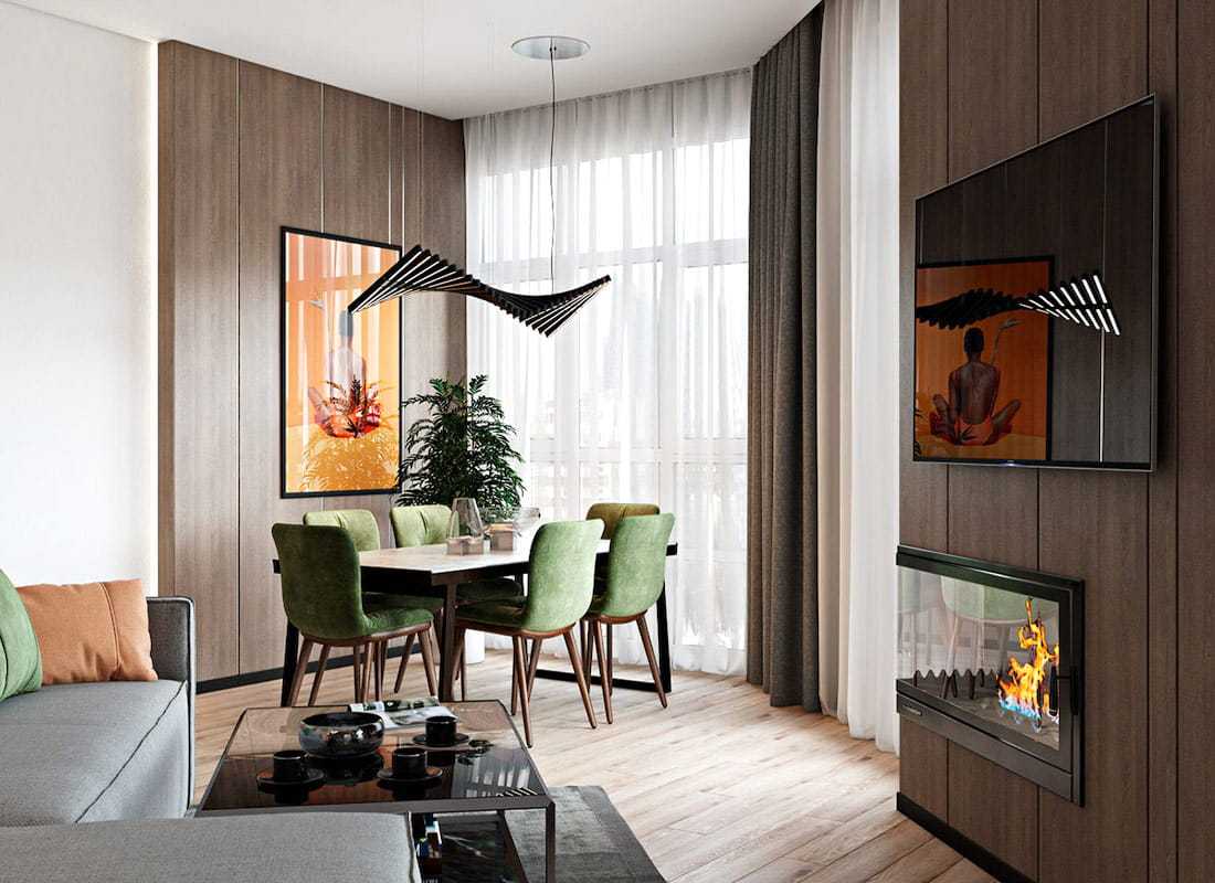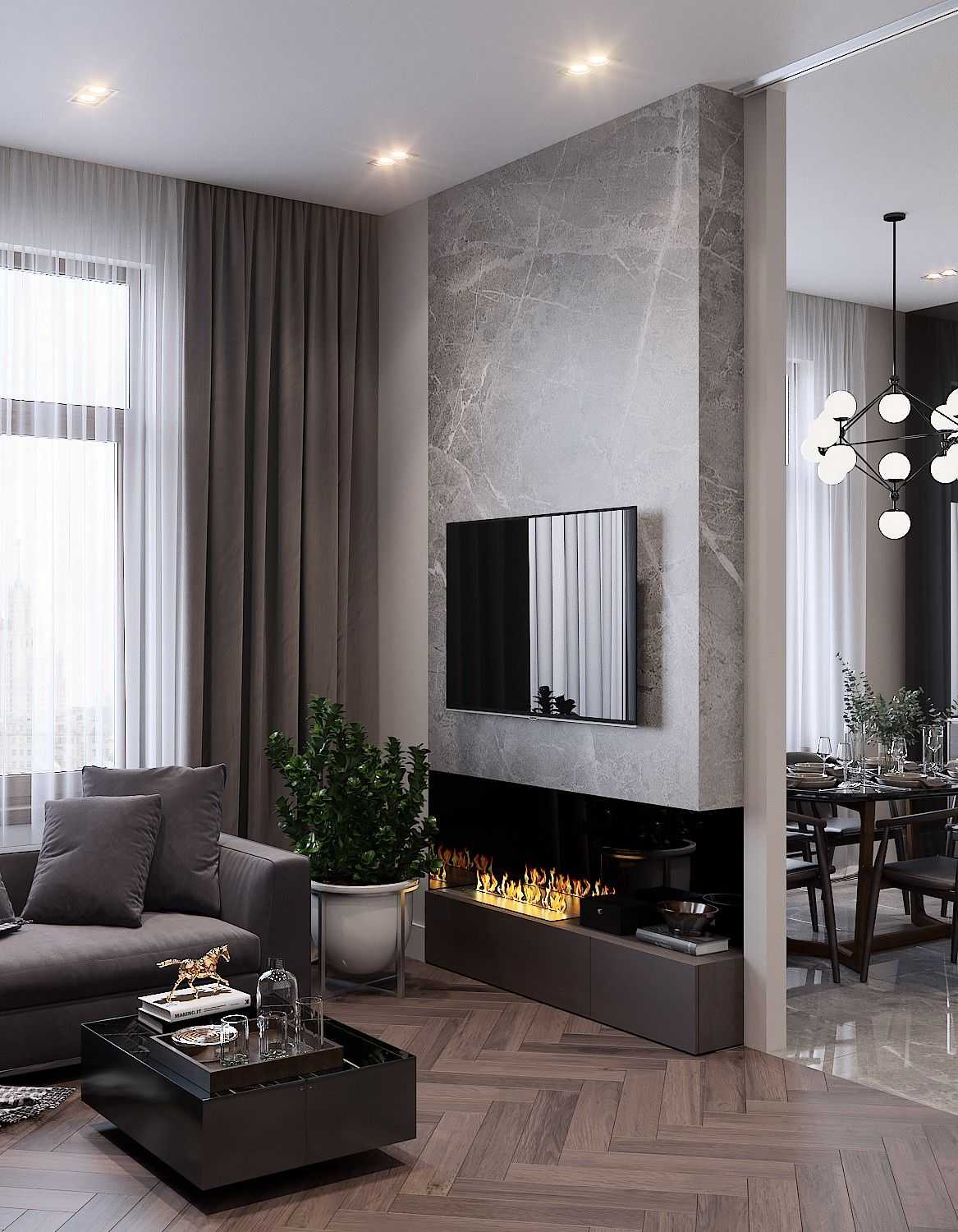 В гостиной можно смело использовать любые материалы, но мы рекомендуем делать отделку максимально лаконичной. Во-первых, это главный тренд 2021 года. А во-вторых, не нужно еще больше усложнять интерьер комнаты, которая и так решает сразу несколько задач.