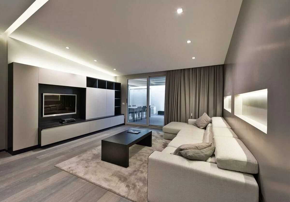 В большой и просторной гостиной лучший выбор – гипсокартонная конструкция со встроенными светильниками. Если комната поменьше, и ты хочешь ее увеличить – используй натяжные потолки. А вот простое окрашивание не так удобно даже для идеальной поверхности. Оно оставляет очень мало вариантов для обустройства освещения.