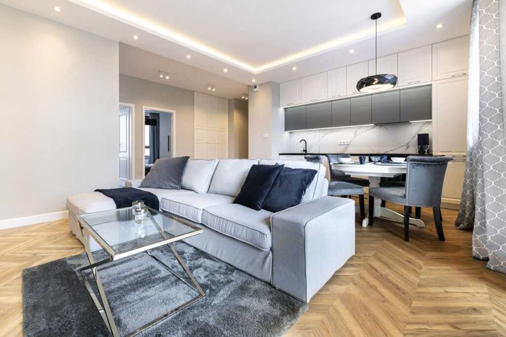 Современную гостиную с кухней в многоквартирном доме из-за ограниченного пространства можно сохранить в более светлых тонах. Здесь идеально подойдут нежные серый и белый, а характер интерьера подчеркнут только сильные аксессуары, такие как: черная фурнитура, красочные шторы или текстильные украшения.