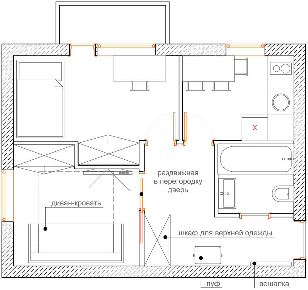 Зонирование выполнено с помощью стеллажей и стен. В главном будуаре расположен диван-кровать (который можно складывать во время прихода гостей), а дверной проём был оснащён полотном с раздвижной конструкцией. Планировка кухни и ванной комнаты оставлены без изменений.
