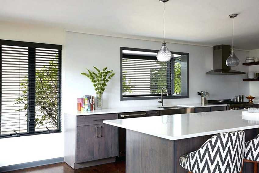 Необыкновенным решением являются мультифактурные жалюзи на кухню. Фото современного дизайна интерьера помещения наглядно показывают разные модели изделий. Такие шторы сразу соединяют внутри себя технические индивидуальности пластмассовых и эстетичное наружное оформление тканевых жалюзи.