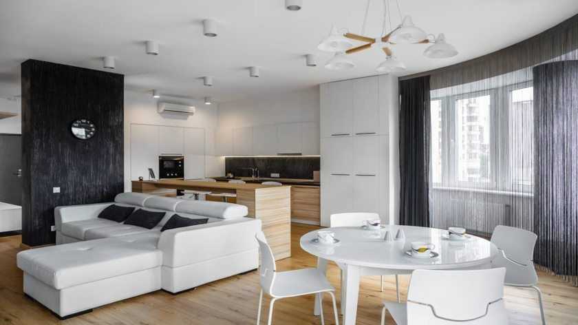 Мебельное зонирование в монохромном интерьере