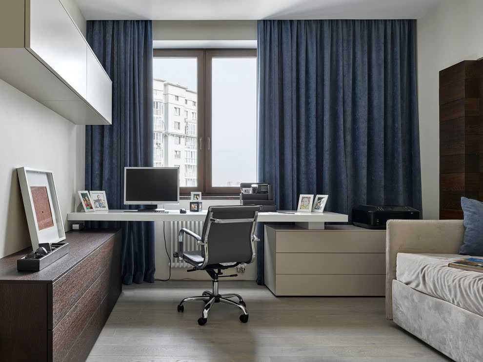 Примеры синих штор в интерьере гостиной представлены на фото. Так как пространство не позволяет, в гостиной лучше отказаться от тяжелых и темных портьер, чтобы не перегрузить пространство и не сделать его слишком мрачным