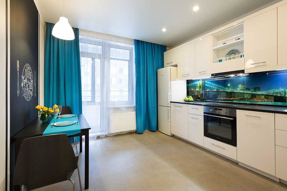 Для интерьера кухни идеальным вариантом станут короткие голубые занавески или складные римские, либо рулонные шторы. Интересно будут смотреться короткие шторки насыщенного голубого цвета на фоне светлой отделки и белого гарнитура.