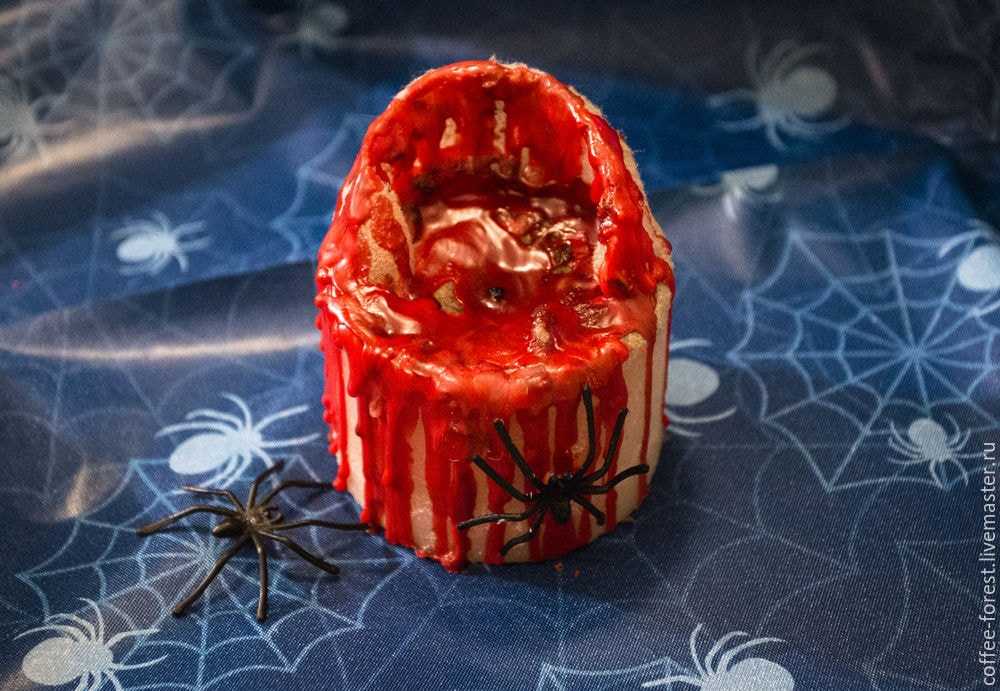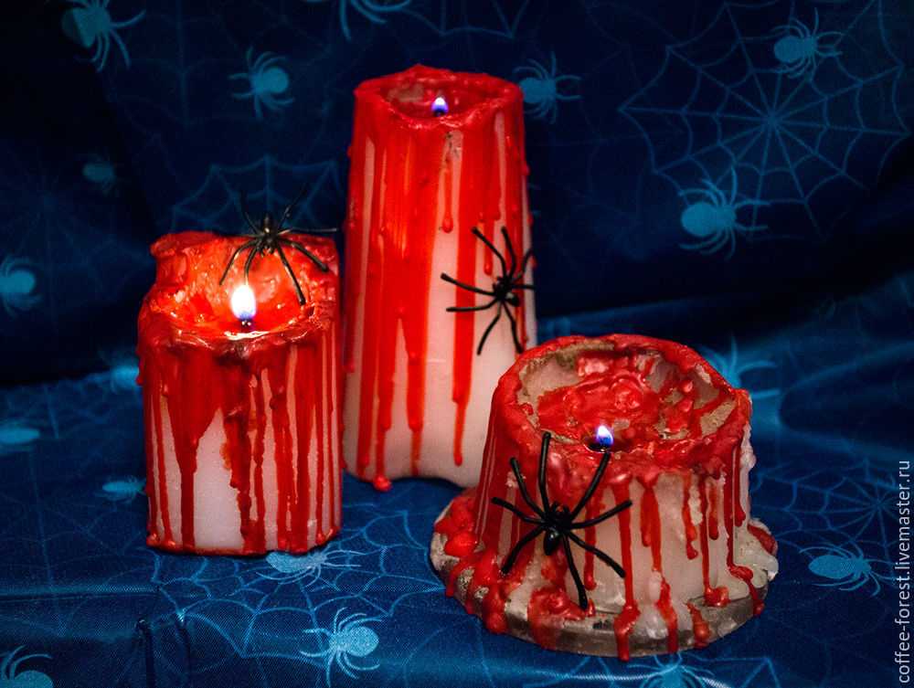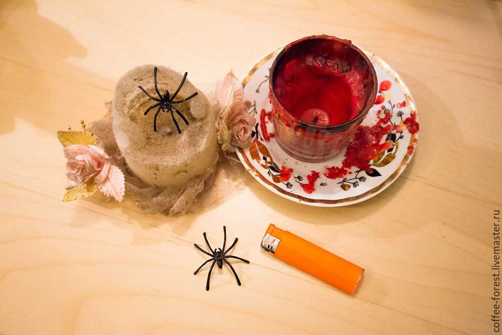 Когда парафин высох, декорируем по желанию свечу паучками.