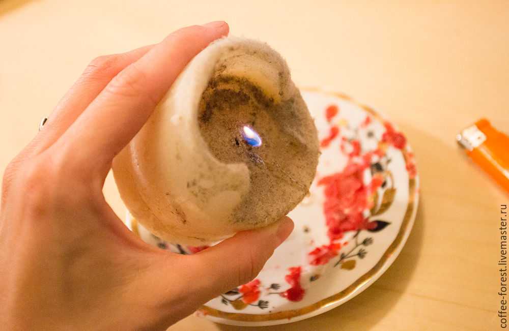 - Когда материал остынет (на это может уйти до 24 часов) необходимо обрезать лишний фитиль и достать свечу из формы.