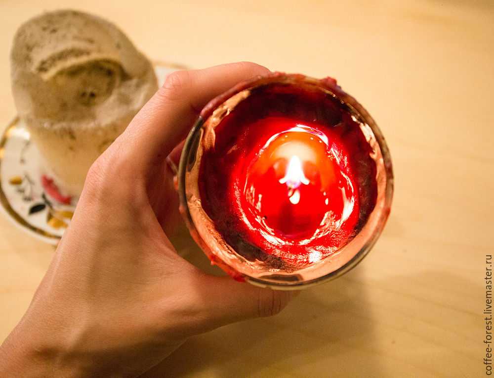 В жестяную банку укладывают материалы, из которых будет состоять композиция, затем ее отправляют на водяную баню. Когда материал полностью расплавится, начинают заливку изделия в подготовленную формочку. Делают это постепенно, один слой за другим. По мере заполнения формы свече дают остыть при комнатной температуре. После полного остывания ее извлекают из формы, обрезают лишнюю часть фитиля и приступают к декорированию.