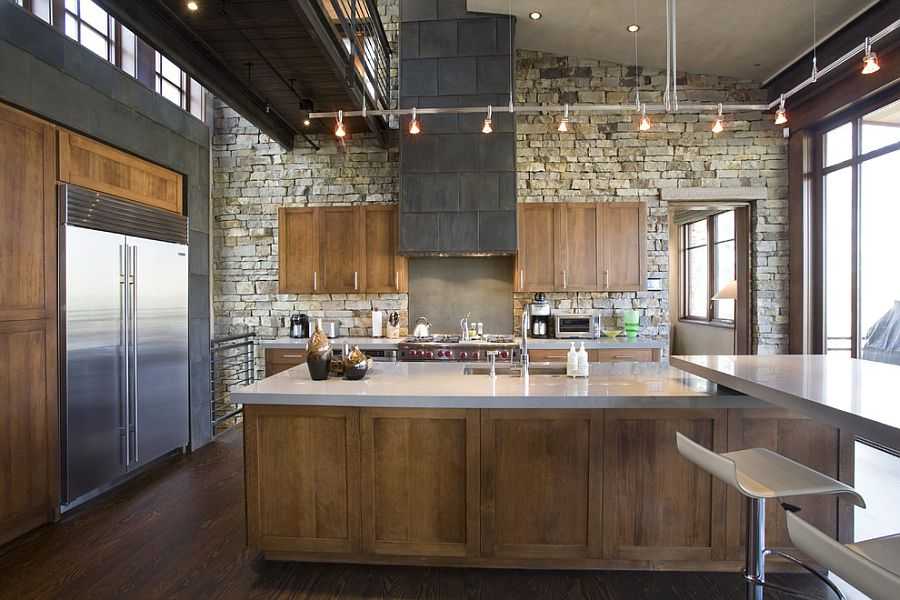 Стена из авантюрина вносит очарование деревенского стиля в индустриальный образ современной кухни