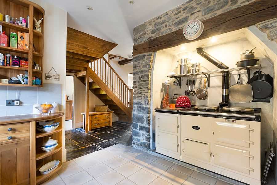 Кухня в фермерском стиле с каменной стеной и плитой от La Cornue (от Squarespace).