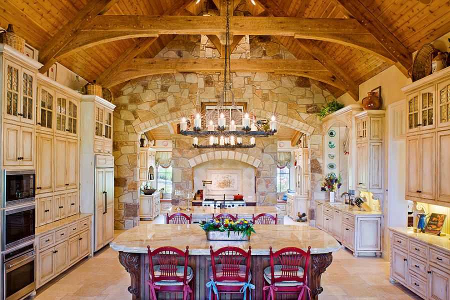 Когда вы задумаетесь о возможных вариантах отделки кухни камнем, первое, что придет вам в голову, будет кантри-стиль. На таких кухнях каменная стена является акцентирующим дополнением к естественному фону, она усиливает, подчеркивает уже сформированный стиль пространства. Каменные стены с грубой отделкой и нарочито неаккуратной кладкой хорошо соответствуют деревенскому стилю, при этом кухня сильно выигрывает от фона в теплых тонах.