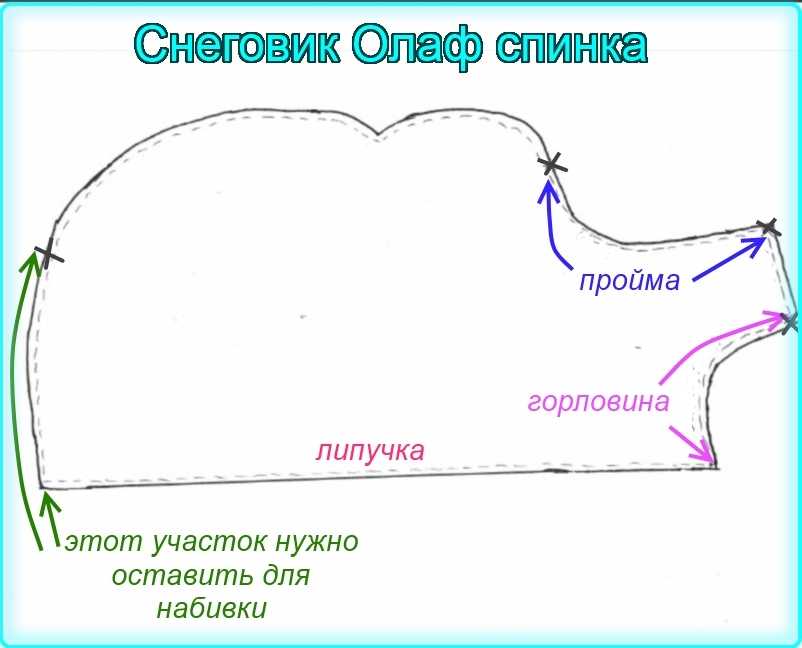 Выкройка костюма снеговика для его задней части будет мало чем отличаться от передней. Но на спинке должна быть липучка. Решить набивать спинку или нет, можно исходя из количества материала для набивки, который у вас есть. Если спинка будет мягкой, то для нее нужно выкроить четыре детали таких, как ниже. Если она будет без набивки — то таких деталей нужно две.